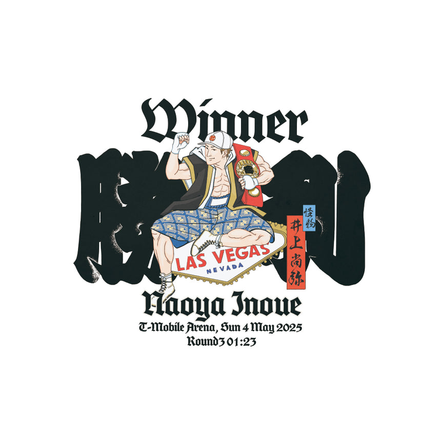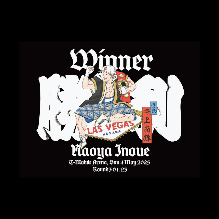 浮世絵風に描かれた井上尚弥選手が、ラスベガスの象徴的なサインボードの上で勝利のポーズを決めるデザイン。